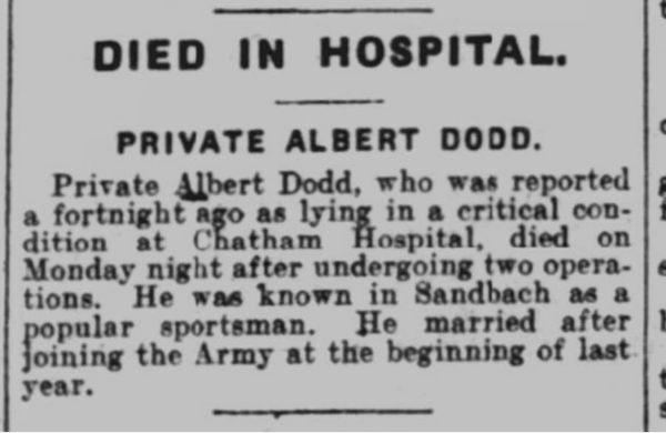 Albert Dodd died on 2nd April 1917, at Fort Pitt Military Hospital, Chatham in Kent. He was 27 years old. He left a widow Grace, whom he had married a year earlier.