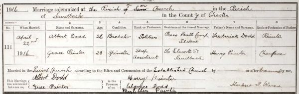 On 22nd April 1916, at St Mary's Church, Albert married 23-year-old Grace Painter (1892 - 1969), a shop assistant who lived at 56 Elworth Street, Sandbach. His sister Clarice was one of their witnesses.