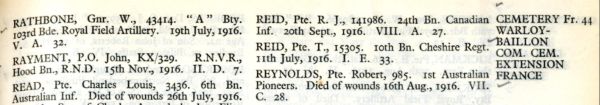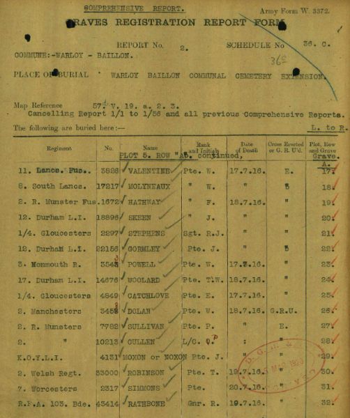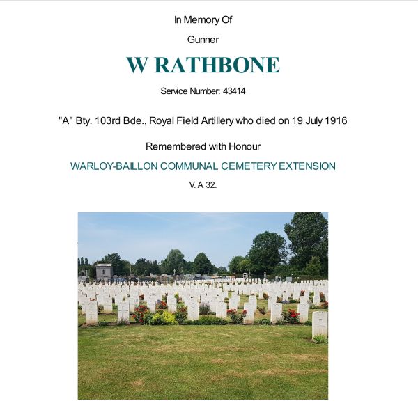 It is likely that William was injured in a Battle of the Somme in northern France. William died of his wounds in the 12th Field Ambulance hospital on 19th July 1916, at the age of 26. He is buried at Warloy-Baillon, a village about 21 kilometres north-east of Amiens along the D919 to Arras.
