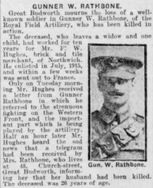 William Rathbone was born in Witton, Northwich on 16th January 1890, the supposed son of Henry Rathbone (1848 - 1929) and Margaret Horsfield (1946 - 1923). In the 1891 census, he is shown as their grandson, and there is no mother's maiden name shown on his birth registration, suggesting that he was quite possibly the son of one of Henry and Margaret's unmarried daughters. However, on later censuses, he is described as Henry and Margaret's son. He grew up at 31 Manchester Street, Witton, then at 6 Norbury Street.