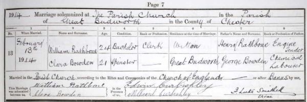 On 18th February 1914, he married 21-year-old Clara Bowden (1892–1973) Great Budworth, and they had one child, Gwendoline (1915 - 1980).