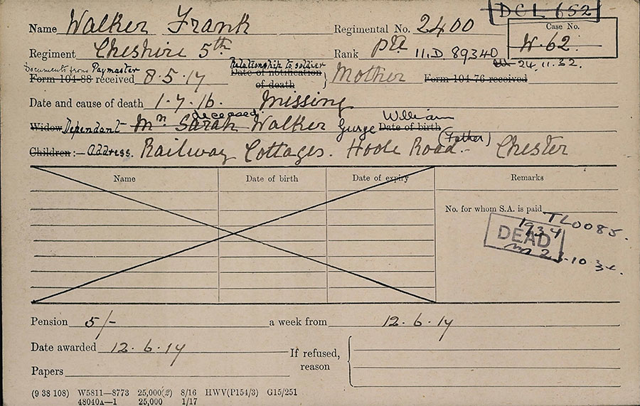 | Regiment: | 1/5th Bn Cheshire Regiment Formerly: 2400 Cheshire Regiment |