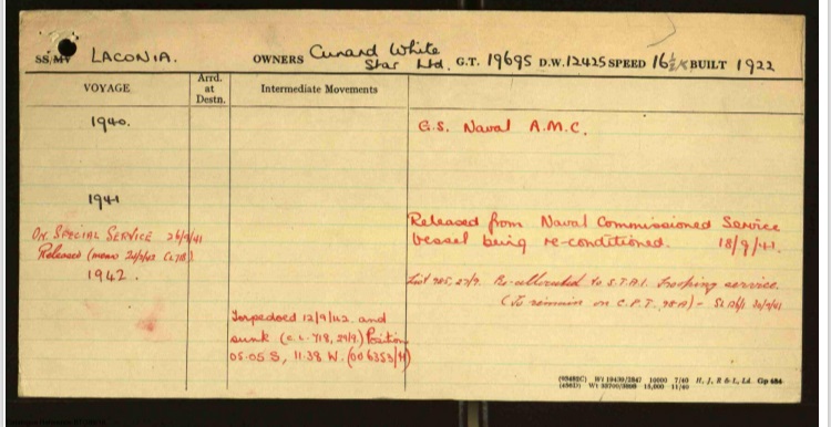 RMS Laconia was an ocean liner owned by Cunard Line. She was requisitioned by the War Department at the beginning of the war for military use and was initially converted into an armed merchant cruiser then later converted into a troop ship equipped with defensive armaments ( DEMS Defensively Equipped Merchant Ship) Royston served as a DEMS Gunner on the ship.