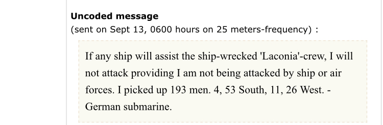 After the incident, Admiral Karl Dönitz issued the Laconia Order, henceforth ordering his commanders not to rescue survivors after attacks.