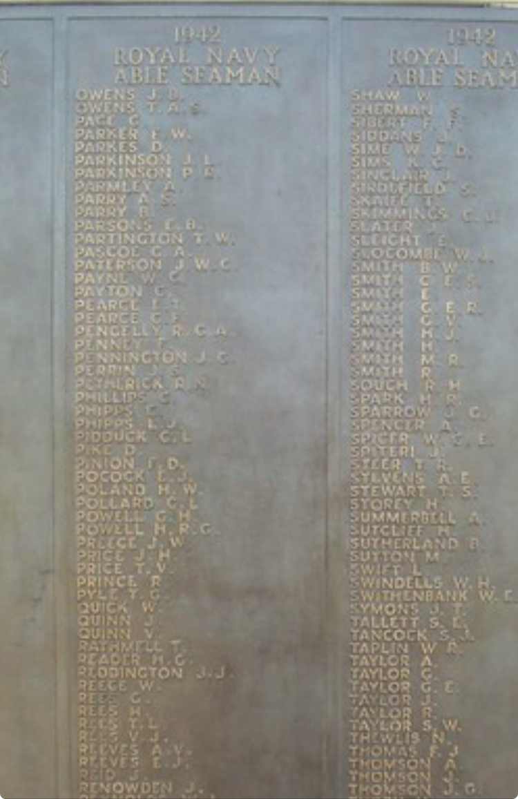 Royston is commemorated on the Royal Navy Memorial at Plymouth