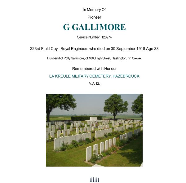 Pioneer George Gallimore 128974 died in hospital on 30th September 1918. He was 38 years old, and left a widow and three sons. He was buried in the military cemetery in La Kreule, which was a small hamlet 2 kilometres north of Hazebrouck, on the road to St Sylvestre-Cappel and Steenvoorde.
