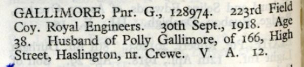 Pioneer 128974 George Gallimore, 223rd Field Company, Royal Engineers, died of wounds at the 17th Casualty Clearing Station, in northern France on 30th September 1916 aged 38. He is buried in La Kreule Military Cemetery, Hazebrouck, France.