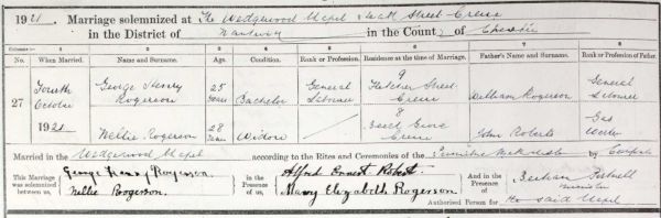His widow Nellie married William's younger brother George Henry Rogerson on 4th October 1921 in the Wedgwood Methodist Church, Heath Street, Crewe. They had three sons - Gordon, Dennis and Alan. Nellie died in 1974.