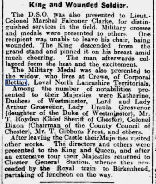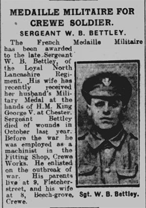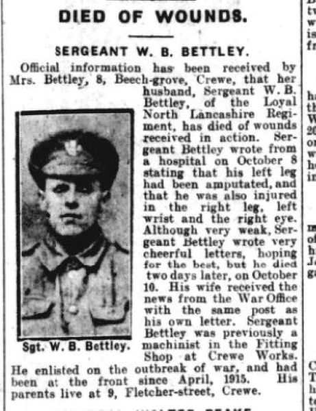 Official information has been received by Mrs Bettley, 8 Beech Grove, Crewe, that her husband Sergeant W.B. Bettley, of the Loyal North Lancashire Regiment has died of wounds received in action. Sergeant Bettley wrote from a hospital on October 8 stating that his left leg had been amputated and he was also injured in the right leg, left wrist and right eye. Although very weak Sergeant Bettley wrote very cheerful letters hoping for the best, but he died two days later on October 10. His wife received news from the War Office the same post as his own letter. Sergeant Bettley was previously a machinist in the fitting shop at Crewe works. He enlisted on the outbreak of war and had been at the front since April 1915. His parents live at 9 Fletcher Street, Crewe.