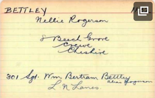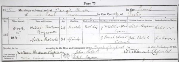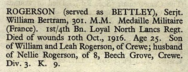 The 1911 census shows his family living at 9 Fletcher Street, Crewe, and using the surname Bettley. William enlisted into the Loyal North Lancashire Regiment at the start of the war using that name. On 15th March 1915, William Rogerson married Nellie Roberts (1893–1974) of 8 Beech Grove, Crewe.