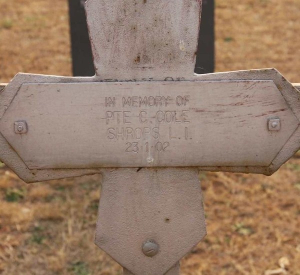 1662 Private C. G. Cole, 2nd King's Shropshire Light Infantry, died of disease on 23rd January 1902 at Middelburg, Transvaal. He is buried at Middelburg Cemetery, South Africa. He was awarded the Queen’s South Africa medal, with clasps for Johannesburg, Cape Colony and Orange Free State.