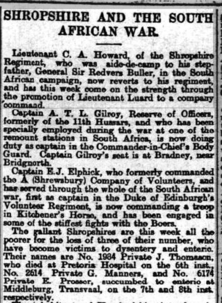His name is listed on the Shropshire Light Infantry Boer War memorial in Shewsbury.
