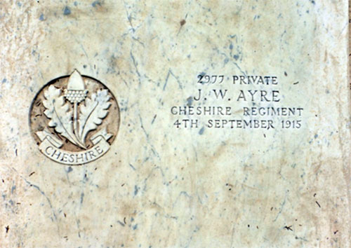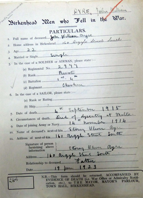 On 14th November 1914, John William Ayre enlisted into the 1st/4th Bn Cheshire Regiment, who were already in training in Northampton. On joining the battalion, he continued training with it here until December 1914, when it was sent to Cambridge. In May 1915, the battalion was sent to Bedford, where it became part of 159th Brigade, 53rd Division. On 16th July 1915, Private Ayre and his battalion sailed from Devonport, on board the S.S. Euripides, and via stops at Gibraltar (20th July 1915), and Malta (24th July 1915); the 1st/4th Bn Cheshire Regiment arrived at Alexandria, Egypt, on 27th July 1915. Three days later, it sailed for Port Said, and sailed to Lemnos, on 4th August 1915. They sailed for Gallipoli on 8th August 1915, and landed at “C” Beach, Suvla Bay, on 9th August 1915. Private Ayre had not been serving at Gallipoli for very long when he contracted dysentery, and was evacuated to a hospital in Malta, where he died as a result of his illness, on 5th September, 1915 His Medal Index Card states that he died on 4th September 1915).