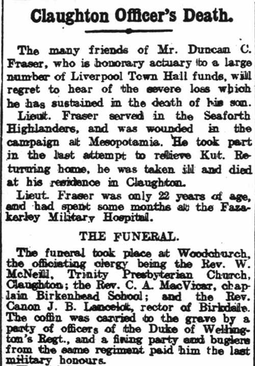 Lieutenant Fraser was given a military funeral and is buried in the churchyard at Holy Cross, Woodchurch. He is remembered on the Birkenhead War Memorial and the war memorial at Trinity with Palm Grove United Reformed and Methodist Church.