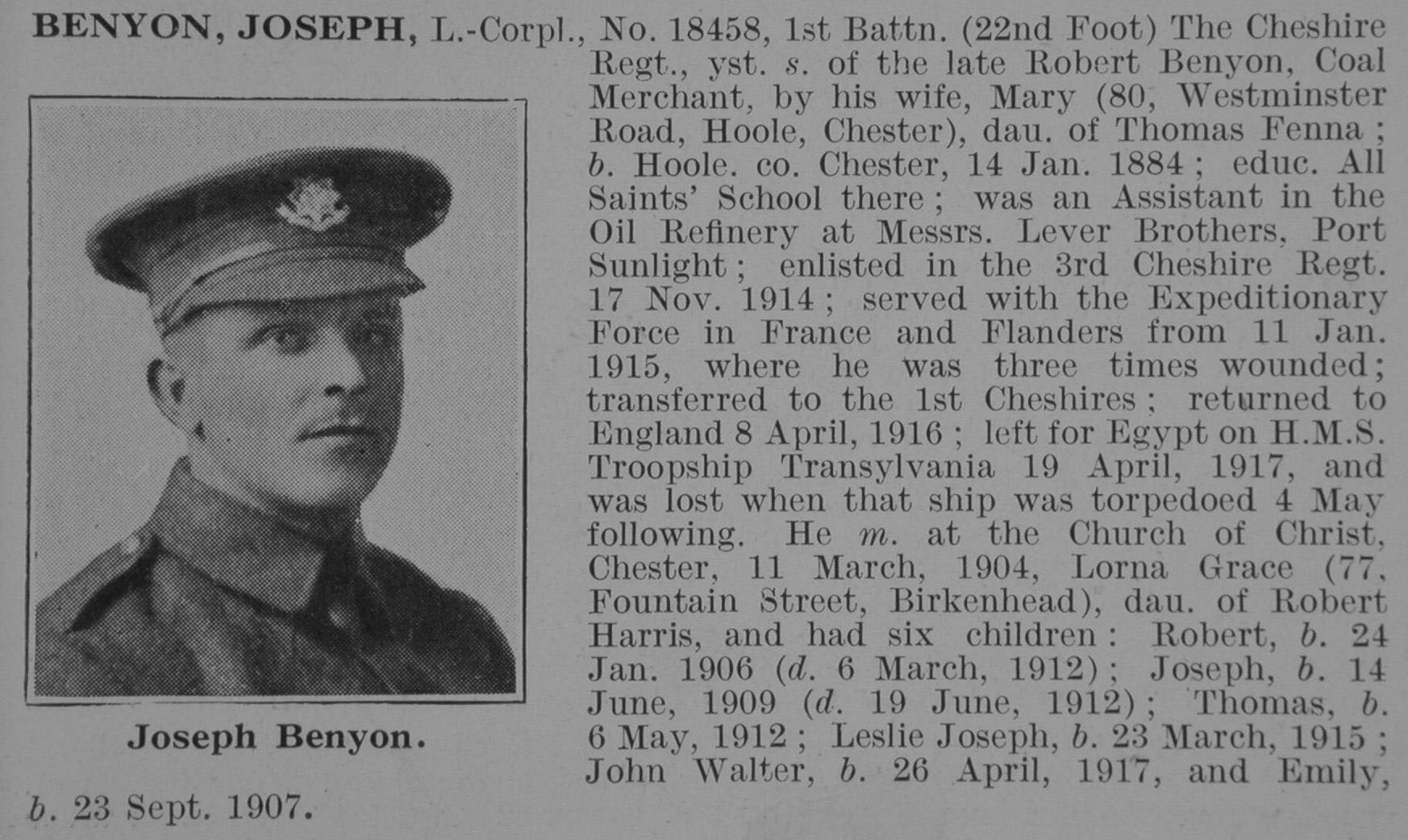 Chester Chronicle 30/06/17“News has been received that Lance Corporal Joseph Benyon, of the Cheshire Regiment, has lost his life at sea. L. Corp. Benyon, whose mother lives at 80 Westminster Road, Hoole, was on a transport which was sunk and his body has been found and buried in Italy. He had been in the forces for nearly two years, and had been wounded three times. Previous to joining the army he was employed at Port Sunlight. He was highly esteemed by all his friends and was well known in Hoole, where he formally lived with his mother. Much sympathy will be extended to his relatives. He leaves a widow and four young children who are at present living in Birkenhead, a mother and several brothers and sisters.”
